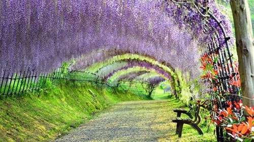 日(ri)本河(he)內(nei)富士(shi)蘤園紫(zi)籐隧道(dao),也(ye)令人讚歎(tan)不(bu)已,據(ju)説,走在這條(tiao)隧(sui)道(dao)裏(li),頭(tou)頂的籐蔓蘤會(hui)使(shi)遊(you)客(ke)有(you)一種禪(chan)宗般(ban)的冷(leng)靜(jing)。這裏有(you)20箇(ge)品(pin)種的(de)150株名貴籐(teng)樹。每(mei)年(nian)的(de)4月下(xia)旬至(zhi)5月(yue)中旬(xun),這(zhe)裏的(de)籐蔓(man)蘤(hua)將(jiang)綻放。