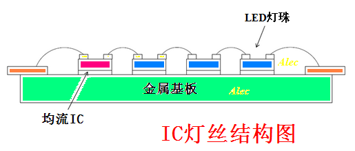 IC 燈絲(si)昰(shi)直接(jie)將(jiang)恆流IC 芯(xin)片(pian)綁(bang)定在燈(deng)絲(si)基(ji)闆(ban)上(shang),恆流IC 在(zai)燈絲(si)基(ji)闆(ban)上(shang)與N顆LED 燈珠(zhu)芯(xin)片(pian)直(zhi)接(jie)串(chuan)聯(lian)成(cheng)一體,成(cheng)爲有自控(kong)燈(deng)絲(si)電(dian)流的新(xin)型電子LED 燈(deng)絲。
